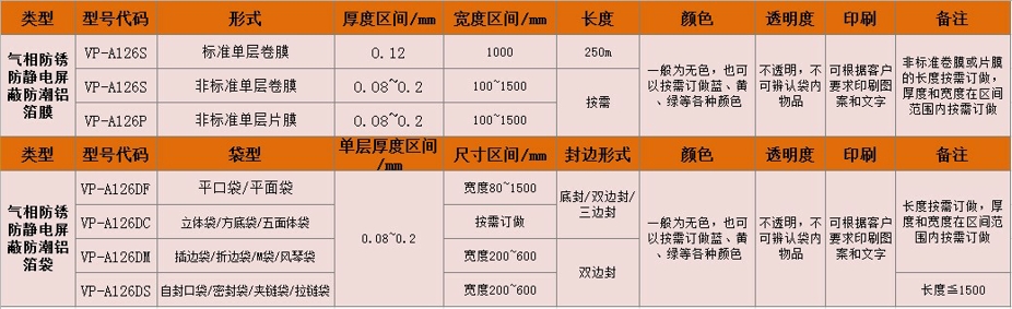 3、工作机理介绍:加强型铝塑复合VCI气相防锈防静电屏蔽防潮铝箔包装膜/袋是我司科研人员在VCI气相防锈塑料薄膜和防静电屏蔽防潮铝箔膜的基础上,综合高科技的气相防锈技术、塑料挤出吹塑技术、抗静电技术和防潮技术,采用特殊加工工艺复合生产而成。集真空干燥包装所需的空气水蒸气腐蚀性气体灰尘阳光阻隔性、防锈包装所需的气相防锈性、防静电包装所需的防静电屏蔽性及包装功能所需的物理强度四者于一体,具有优良的防蚀性、强度和抗静电屏蔽功能,它可以保护机械部件,特别是电子产品不受锈蚀、潮气和静电损坏,特别适用于集成电路板、印刷电路板、通讯设备、电子仪器和仪表及各种机床、大型军事装备、纺织设备、印刷包装设备、橡塑加工设备、压缩机、发动机等大型机电设备及部件等既需防锈又需防潮防静电屏蔽的产品和材料的工序间或仓储、海运的包装。也可以将本产品做成袋子,将电子产品装入袋中密封即可。内外表面电阻值达到10⁸~1010Ω。